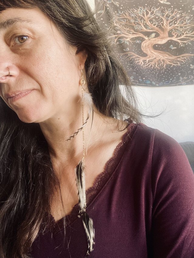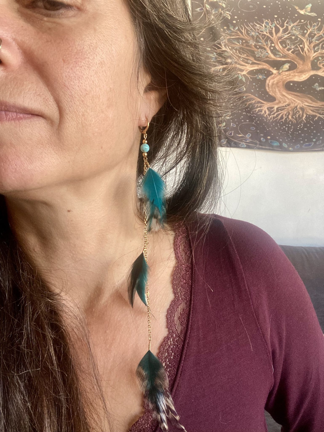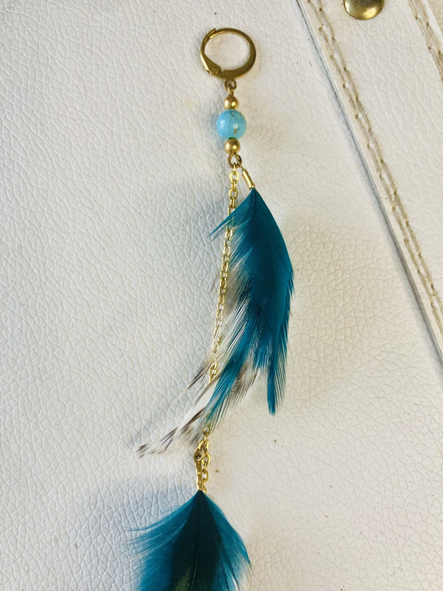 Un accessoire original pour un soirée, cette longue boucle d'oreille solo est en acier inoxydable, composée de 10 plumes de coq naturelles et teintées en bleu canard rassemblées en 3 plumeaux et orné d'une perle turquoise.