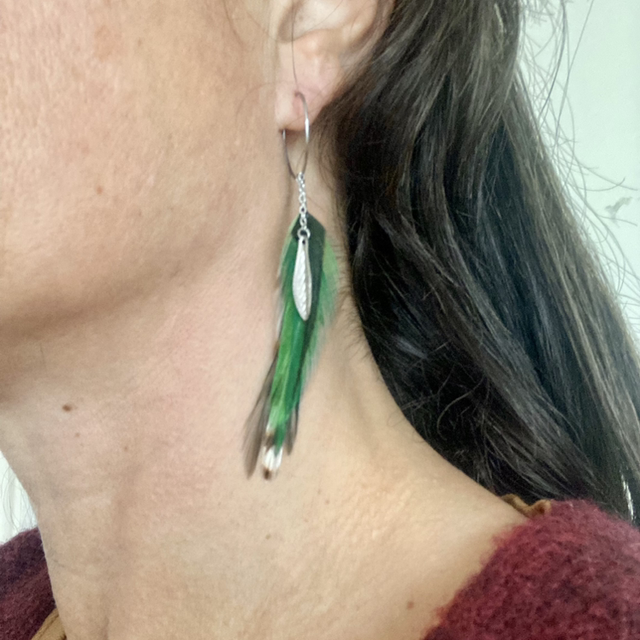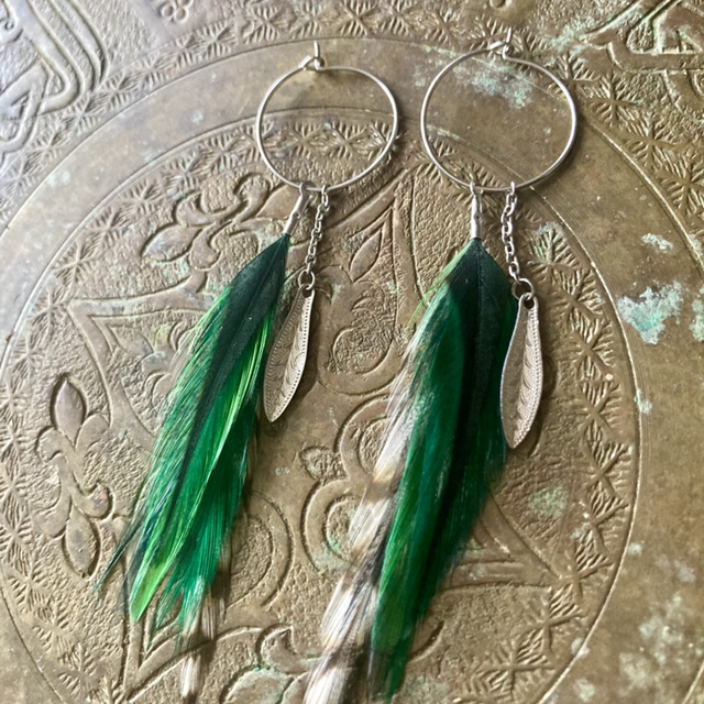 Elles sont composées de 8 plumes de coq naturelle et teintées et d’une breloque en argent ciselée.