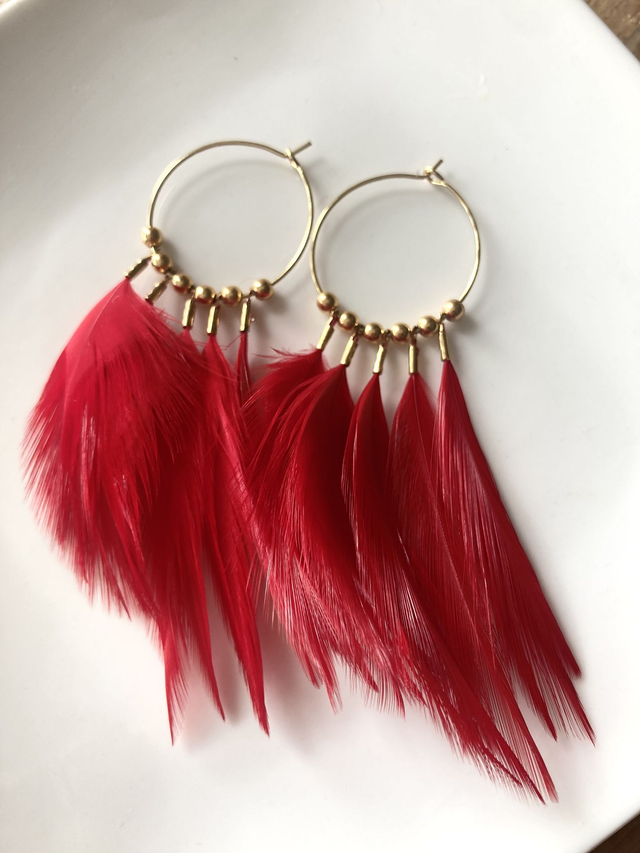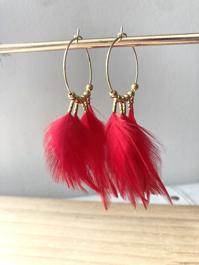 Boostez votre énergie ces jolies boucles d’oreille créole à plumes, ornées de perles dorées.