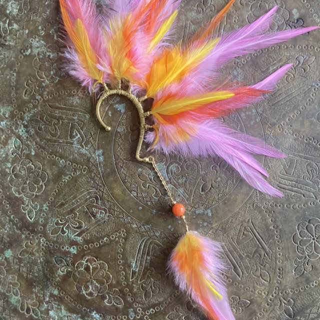 Découvrez les tours d’oreilles en plumes, entièrement réalisés à la main. Ces créations légères et élégantes se posent simplement autour de l’oreille, sans nécessité de perçage.